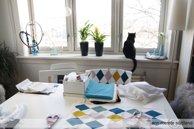 Stua er forvandlet til systue og putetrekk er på gang. Jeg skal bruke kjøkkenhåndkle fra Ferm Living og gleder meg til å pynte opp i sofaen med ny pute. Ja, hvis jeg får det til da. Satser på det! Har klippet, brettet og satt i nåler nå, og etter denne lille bloggepausen er det Bernette sin tur til å vise meg hva hun kan. Klarer vi samarbeidet?