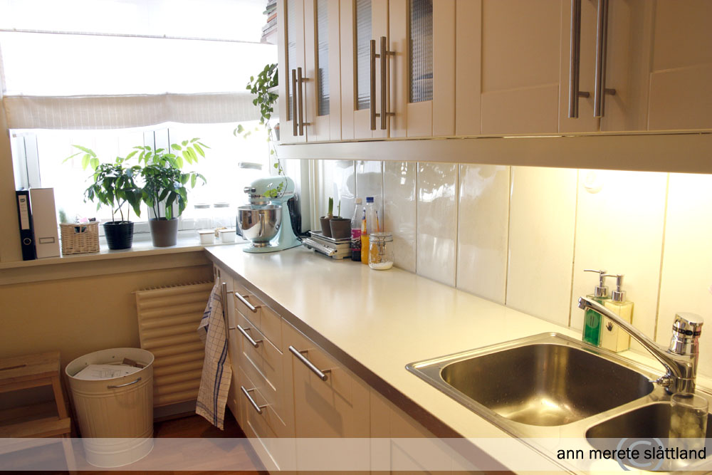 Jeg tok bilder av kjøkkenet litt «sånn som det var», uten å begynne med masse styling og greier. Ryddet selvfølgelig bort oppvasken, da… 🙂