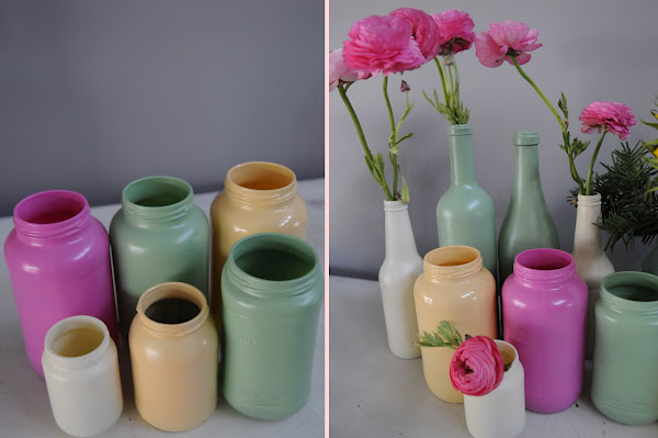 På bloggen The Colorful Living Project (fin blogg!) viser de hvordan en enkelt kan forandre flasker og krukker til fine vaser med spraylakk.