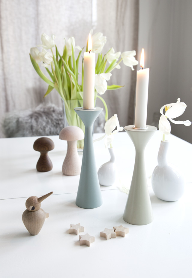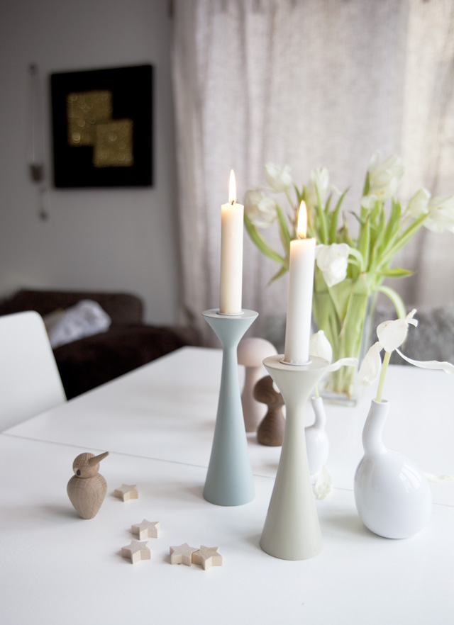 Lysestakene er fra Søstrene Grene. Jeg liker både formen og fargene. Det er noe med duse isfarger nå på vinteren, det er så fint å bytte ut den røde jula med litt roligere fargetoner. Det er litt sånn jeg føler behov for å ha det inni meg også; rolig, litt dust og klart. Ryddig før man tar fatt på alt man har lyst til i det nye året!