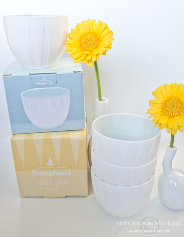 Opprinelig så jeg for meg at jeg skulle kjøpe en annen farge, for sakte, men sikkert har korall begynt å skrike etter å komme inn i hus. Eller så er det kanskje jeg som skriker etter korall, det er nok mer slik. Det viste seg at fargen på akkurat disse var mer rosa enn korall, og da skjønte jeg at jeg måtte være tro mot de nåværende favorittene; gul og isblå/mint. Skålene finnes altså i fire forskjellige farger, det er en blå en også.